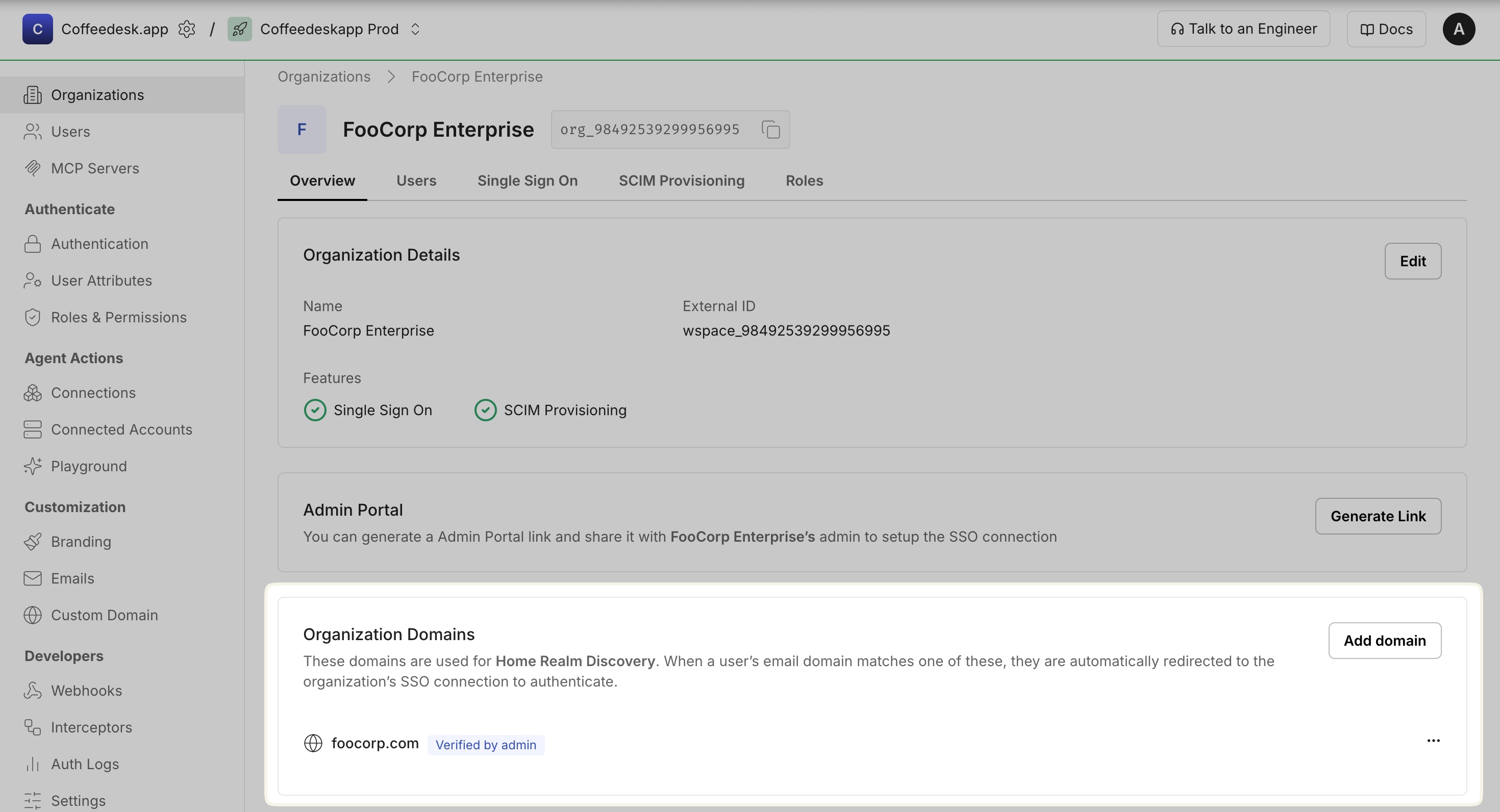Administrators typically register organization-owned domains through the admin portal. When a user attempts to sign in with an email address matching a registered domain, they are automatically redirected to their organization’s designated identity provider for authentication.