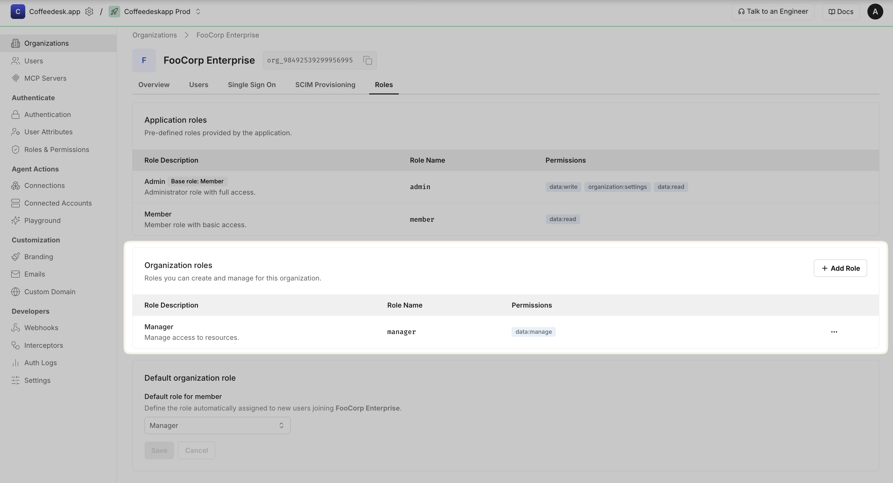 Organization-level roles let organization administrators create custom roles that apply only within their specific organization. These roles are separate from any application-level roles you define.