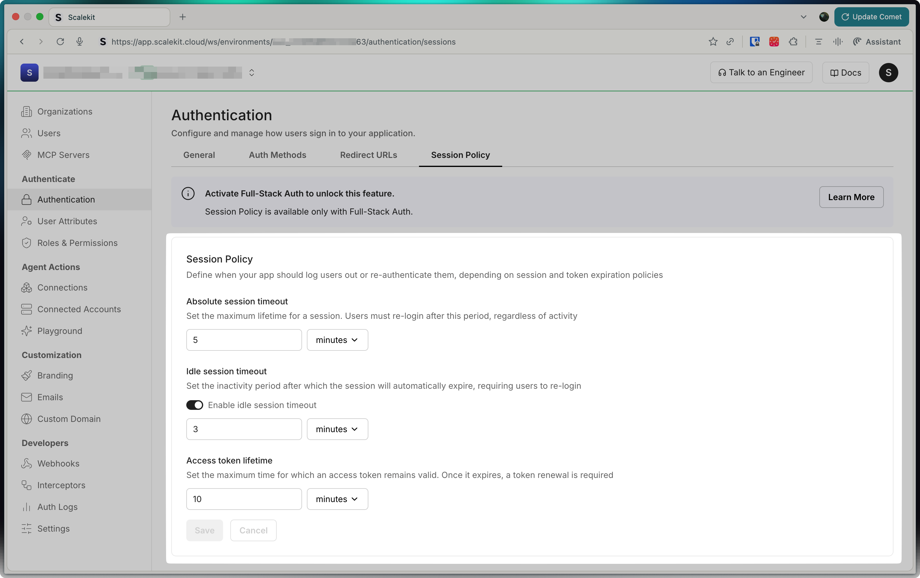 Section titled “Configure session security and duration”Manage user session behavior directly from your Scalekit dashboard without modifying application code. Configure session durations and authentication frequency to balance security and user experience for your application.