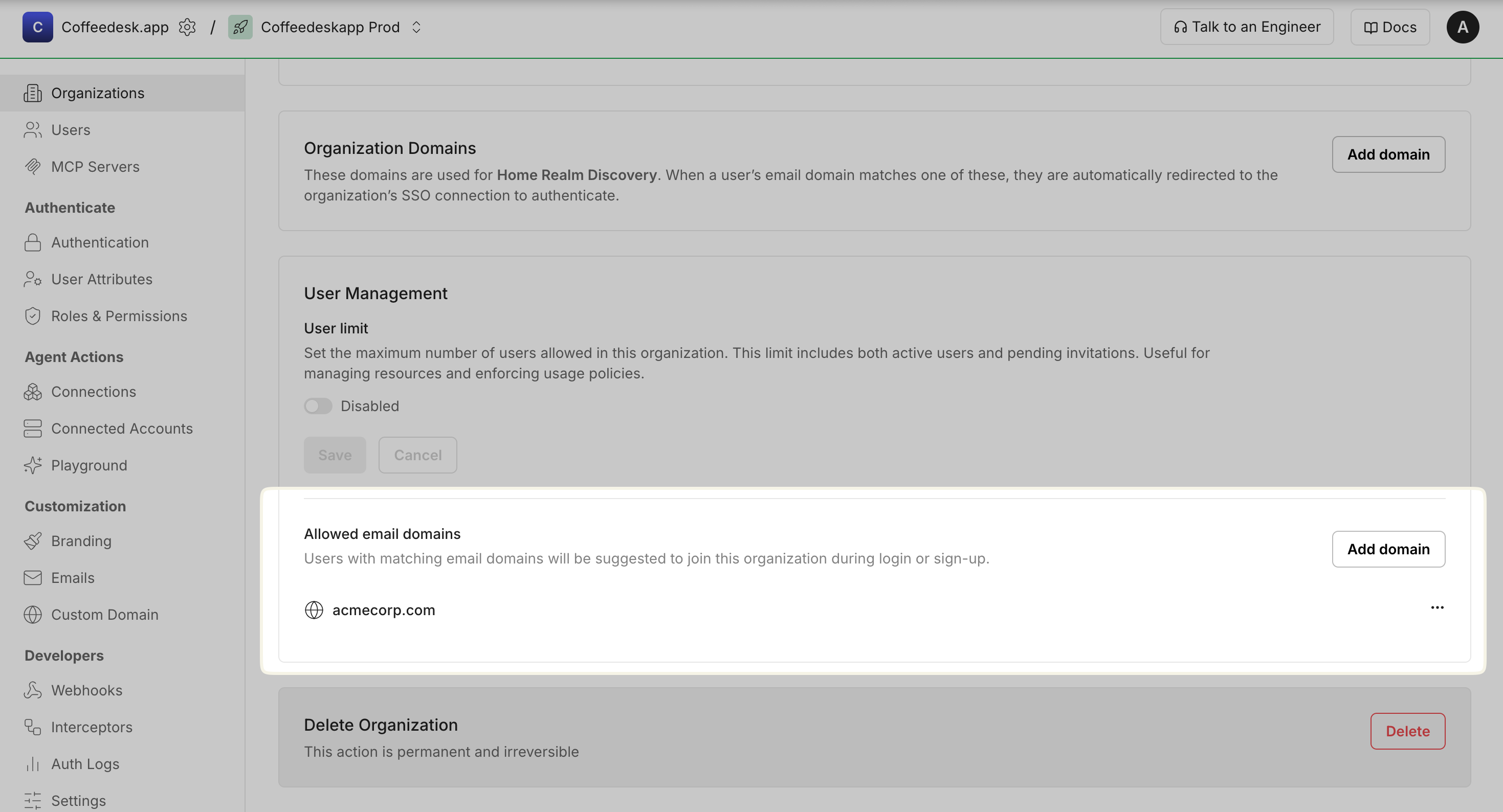 // 4. Delete an allowed email domain// Use case: Remove domain restrictions or clean up unused configurations// Caution: Deletion is permanent and may affect user accessawait client.domain.deleteDomain(organizationId, domainId);