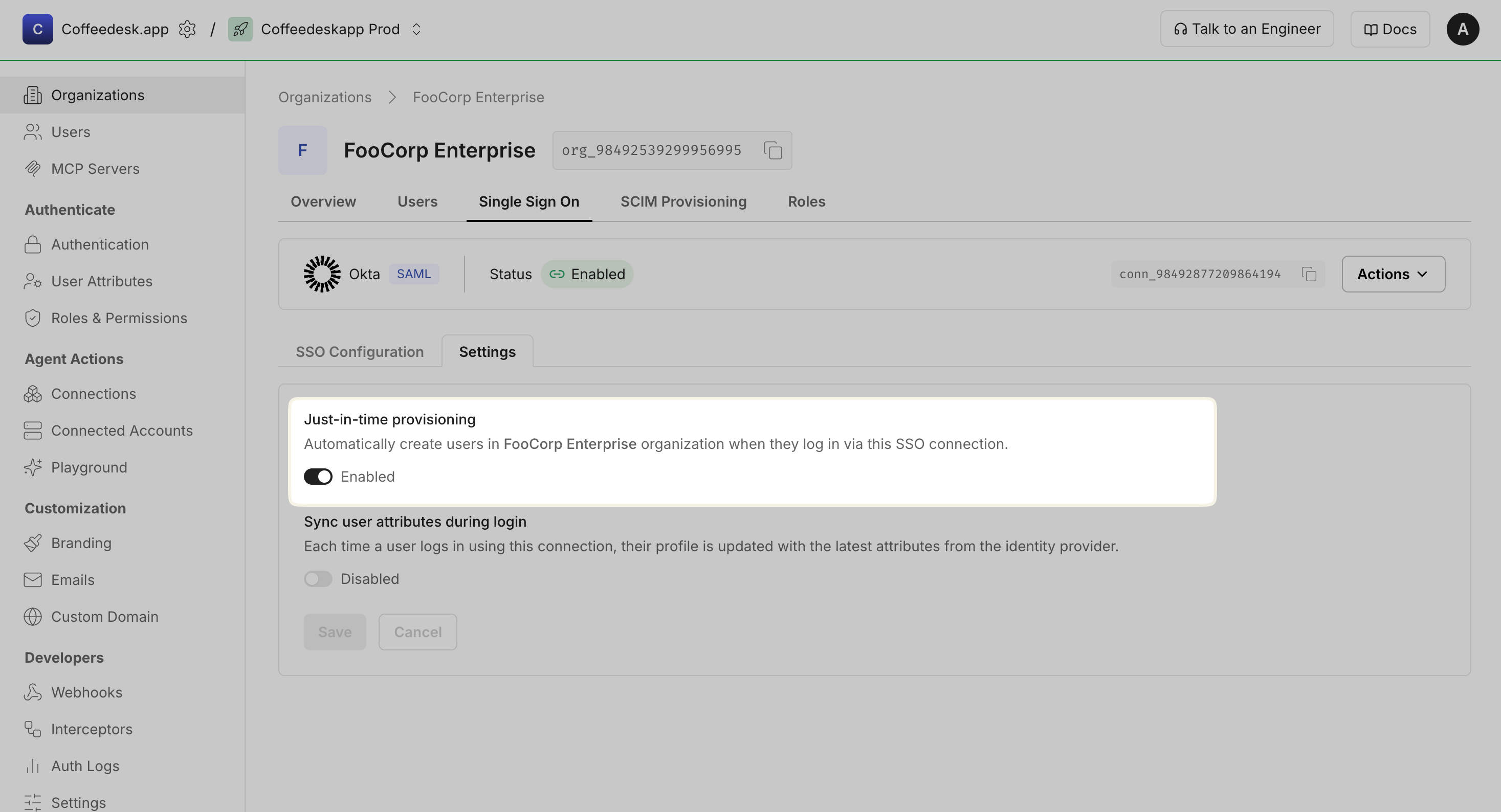 Section titled “Using self-service Admin Portal for organization admins”Your customers (organization admins) can manage JIT provisioning settings through the Admin Portal, including registering organization-owned domains, toggling JIT provisioning on or off, and keeping user profiles in sync with the identity provider.