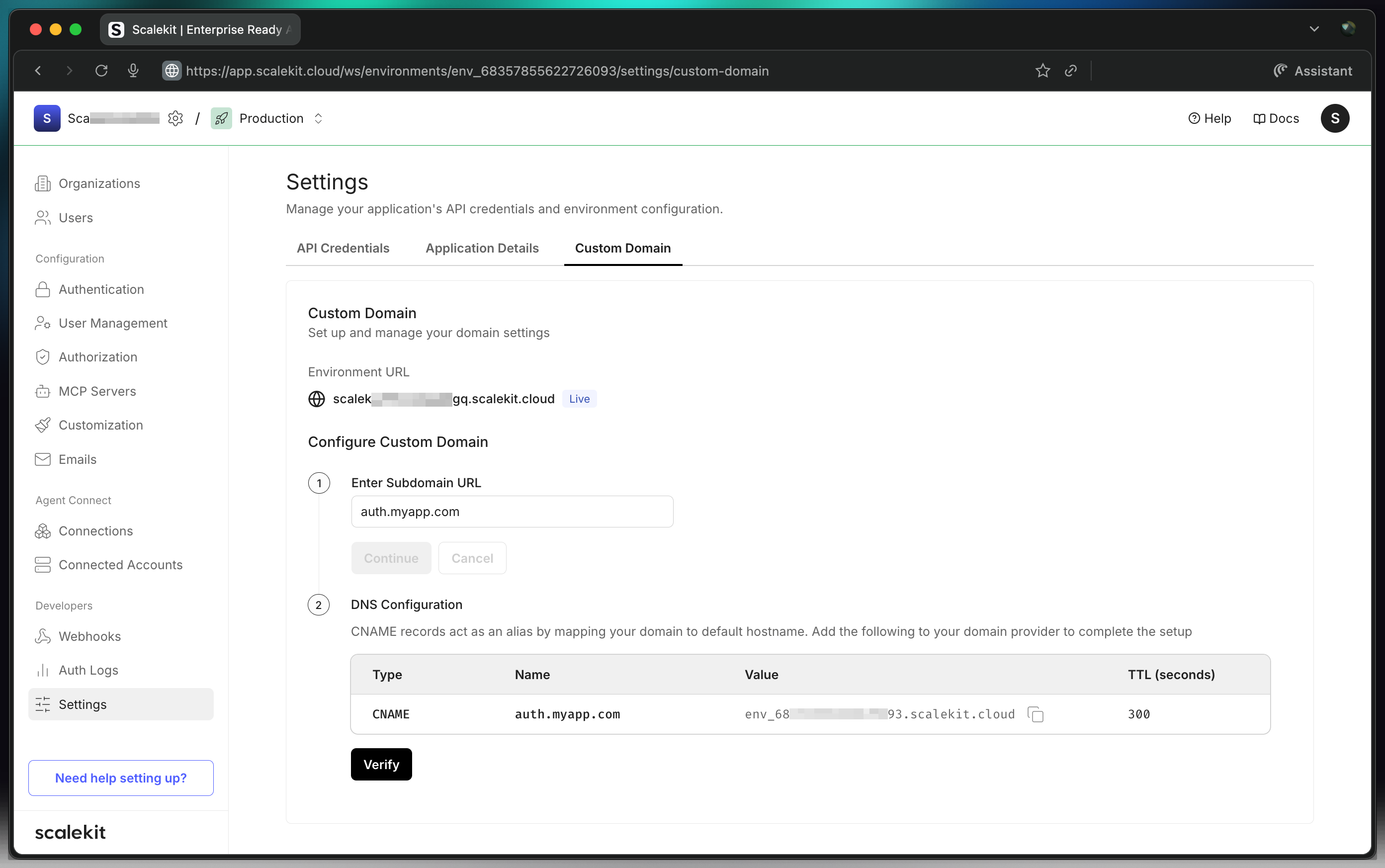 7. Return to Dashboard > Customization > Custom Domain in the Scalekit dashboard and click the Verify button. This validates that your CNAME record is properly configured and accessible.